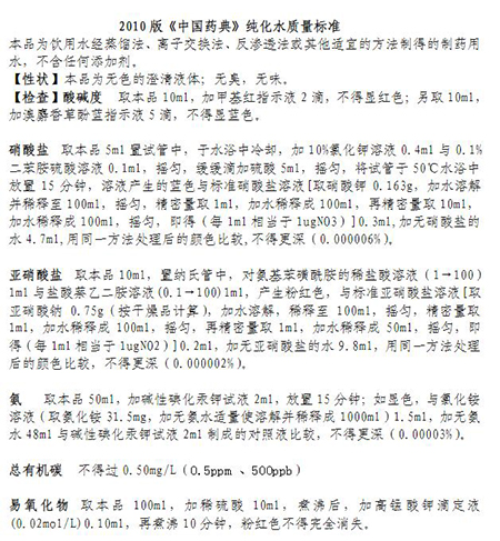 2010版中國藥典中明確指出,飲用水經(jīng)蒸餾法、離子交換法、反滲透法或其他方式制得的制藥用水,總有機(jī)碳檢測不得超過0.50mg/L(0.5ppm、500ppb)、不揮發(fā)物檢測遺留殘?jiān)坏眠^1mg、電導(dǎo)率(10℃,≤3.6µs/cm),(20℃,≤4.3µs/cm),(25℃,≤5.1µs/cm),細(xì)菌、霉菌和酵母菌總數(shù)每1ml不得過100個(gè)。